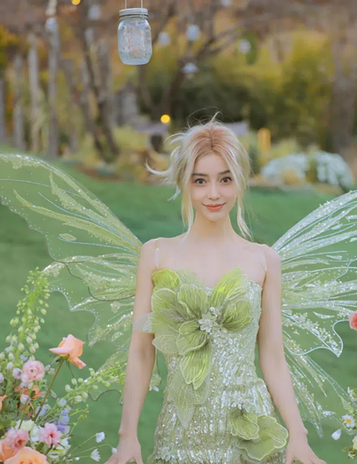 将浅金色的长发卷起,露出香肩,搭配淡绿色的公主裙和翅膀,真的会误以为她是跌落凡间的精灵。梦幻般的氛围感被她掌握的牢牢的,不管走到哪里都仿佛自带仙女滤镜,与平日的baby有点不同。Baby日常还是以深发为主,优雅又温柔,也不少身为妈妈的成熟感。但若女友们的五官立体,浅发更能带出混血感,让你无论何地都能自带滤镜,营造属于你的独家氛围。