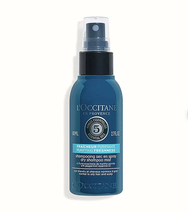 这款干洗发与粉状的喷雾不同,它是少见的水雾状,因此不会留下白色,也不会堵塞毛孔。它主要靠精油萃取来达到控油的效果,你只需要喷在发根靠近头皮的地方,再用梳子梳开,原先扁塌的油头会立刻蓬松起来,像刚洗完头发一样清爽。而且它还自带雪松薄荷的木质香调。