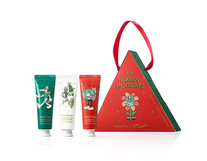 Innisfree再次跟加州艺术家Steven Harrington合作,带来了绿色假日的圣诞限量款。以圣诞挂饰呈现的护手霜组合有Green Tea, Olive, 和 Canola Honey共3种味道,你可以一个人独享,或者当做圣诞小礼物跟朋友们分享,打造滋润的“玉手”。