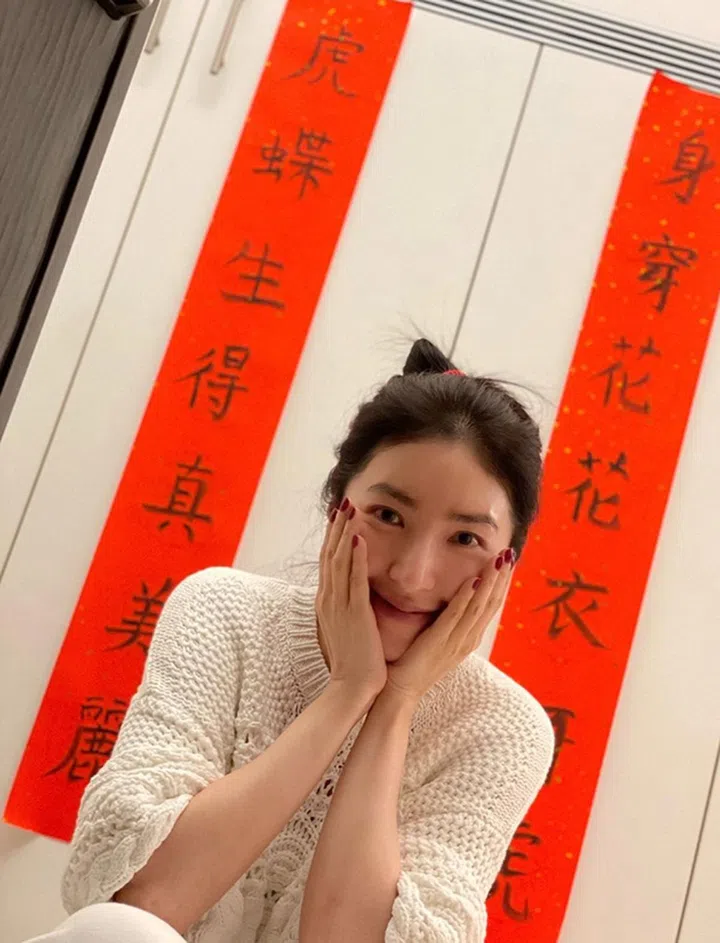 趁新年,杨瑾华也尝试第一次自己手写春联,以简单的丸子头和素颜与大家拜年,又何尝不是更加“私密”与温馨的拜年方式?