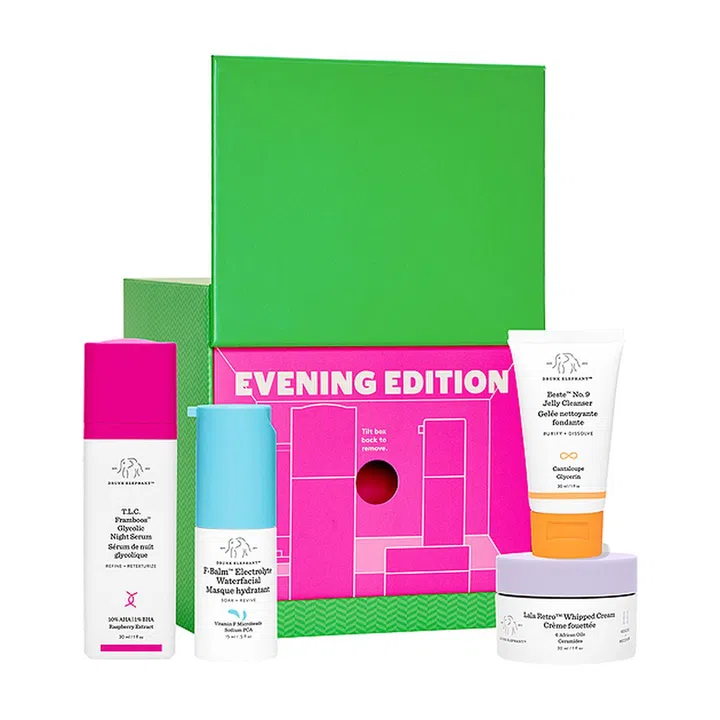 Drunk Elephant的全套限量版的夜间套装产品,旨在你随心搭配使用!你可以先用Beste No. 9和T.L.C. Framboos洗掉彩妆和污染,再用Lala Retro去除多余角质,最后涂抹 F-Balm在睡眠时为肌肤提供足够的水分。