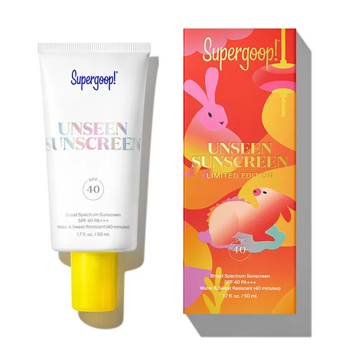 在炎热的天气下到处拜年,请别忘了搽防嗮。这款Supergoop “Unseen” 防晒具有SPF 40,同时并无酒精添加,不刺激肌肤也不闷痘,高倍轻润好推匀。其核心成分包含红藻提取物和乳香提取物,有助于补水并防御抵各种光伤害,包括电子产品的蓝光。特别和兔年包装,是不是很讨喜?