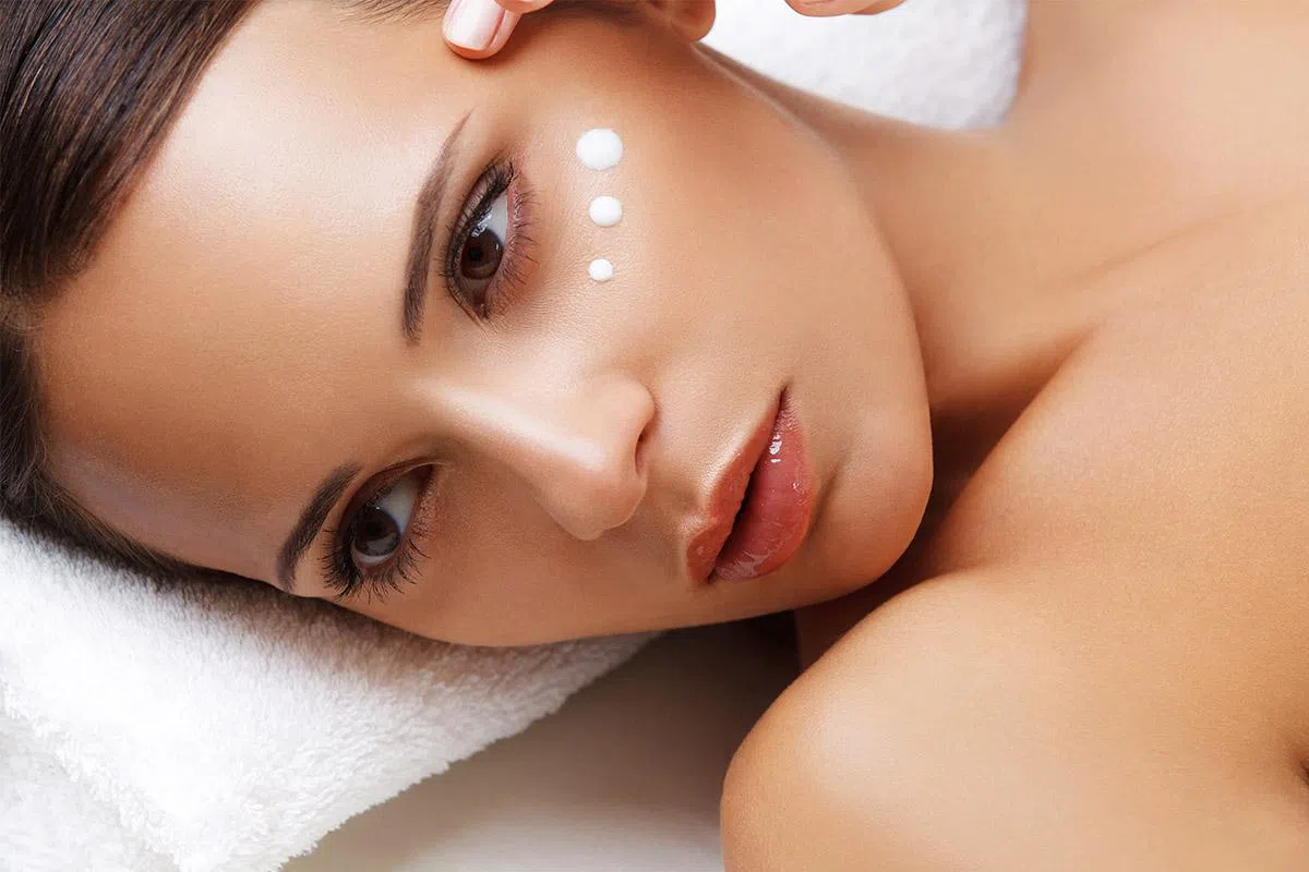 Close-up of a Young Woman Getting Spa Treatment. Cosmetic Cream on a Cheek. Skin Care