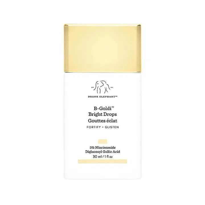 B-Goldi™ Bright Drops是一种混合了5%烟酰胺、二葡糖酸没食子酸和桑叶提取物的亮白产品,它可以淡化色素沉淀、黑斑和痘印,还能改善肌肤的透亮度和光泽度。此外,配方还添加了滋养和舒缓肌肤的Omega,可滴入其他精华和底妆产品中混合使用,让肌肤呈现金灿灿的光泽。