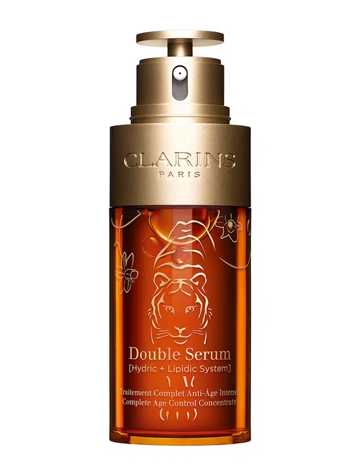 这款“大神级”精华, 在虎年推出特别设计 包装并加量(75ml), 以套组形式出售 (全套包括迷你装V Shaping Facial Lift精华、Total Eye Lift精华、Tonic Body Treatment Oil精华油和Lip Comfort Oil 唇油。双层油水精华 Double Serum含21种活性植物成分和高浓度姜黄精华, 可提升肌底细胞相互“沟通”,再配合仿真皮脂膜渗透技术 促进吸收力, 全方位紧肤抗老。