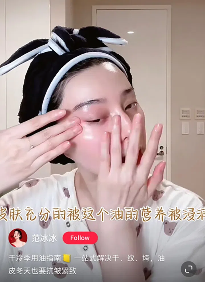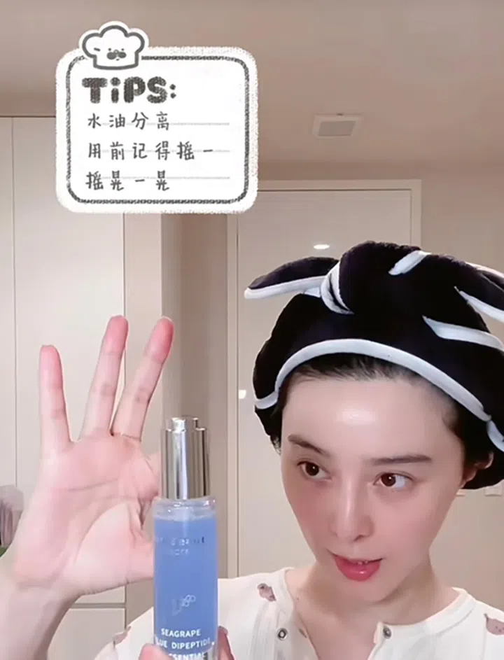 不同肤质所需要的油类产品不同,大油皮往往不能接受过于厚重的油类产品,而过于清透如水的精华油也对大干皮起不到任何作用。范冰冰在视频中推荐了Fan’s Beauty新品——海葡萄双肽精华油,其水油分离的配方不会过于油腻,但仍然非常滋润。拥有相同质地的精华油还有Nomel的Sincere Hybrid Boosting Oil,小编也很推荐,记得在使用前摇晃均匀。