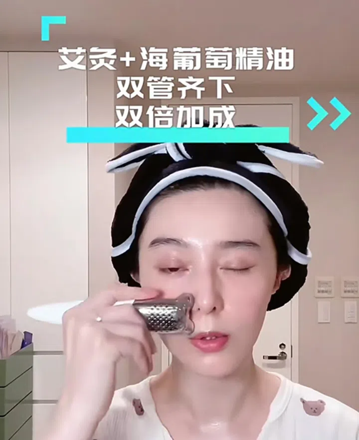 范冰冰的第二泵精华油可不简单,她会搭配艾灸按摩仪来加倍精华油的功效,着重提拉眼肌,但一定要避开卧蚕部位,这样可以紧致眼周肌肤,同时促进血液循环,减轻黑眼圈。另外,艾草也有均匀肤色的功效,是非常适合敏感肌使用的天然成分。