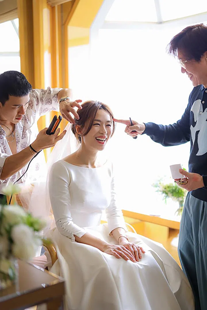 当天妆发的椅子很低,她也看不到镜子,所以直到完妆后她才看到,然后说了一个字“哦!”她很惊喜也很满意啦!其实我们几个人都会觉得,“好看”甚至“完美”的妆容都不是当天的重点,她不需要做最美新娘,而是最开心的新娘。