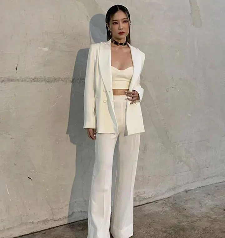 Max Mara白色套装带出了Ferlyn叛逆、高冷的一面。妆容方面选用红色眼影为造型添加色彩,内眼角也用眼线向内拉长,打造“狐狸眼”的妩媚!