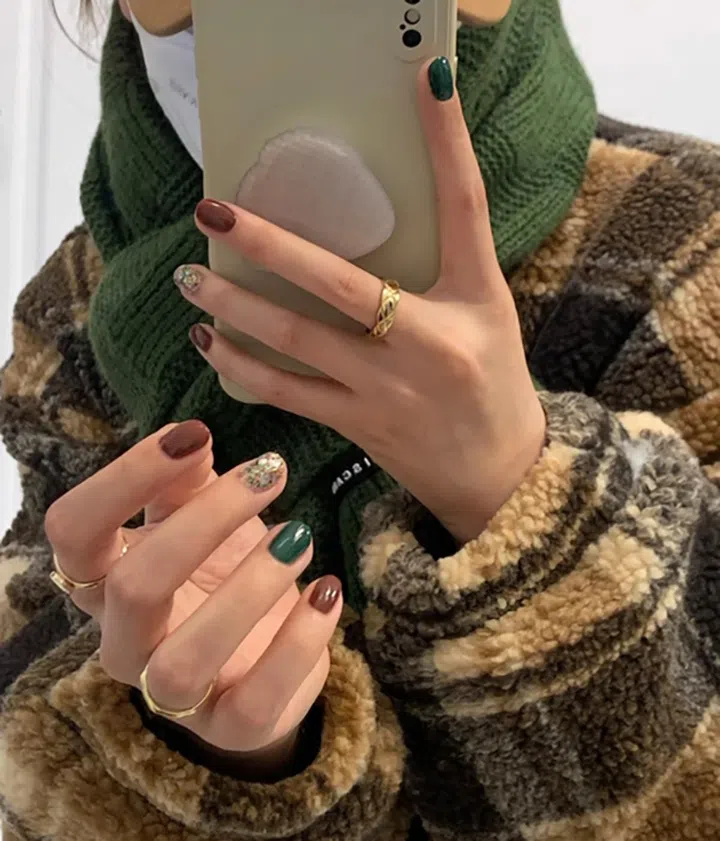 褐色和深绿色都是充满秋冬感的颜色,充满了神秘,略带深沉但又不失色彩。若觉得这样的配色过于无趣,女友们大可以选择亮片色或其他圣诞元素作为点缀。