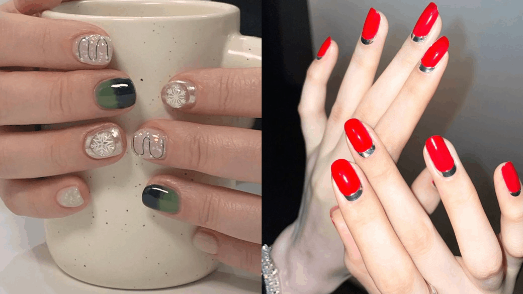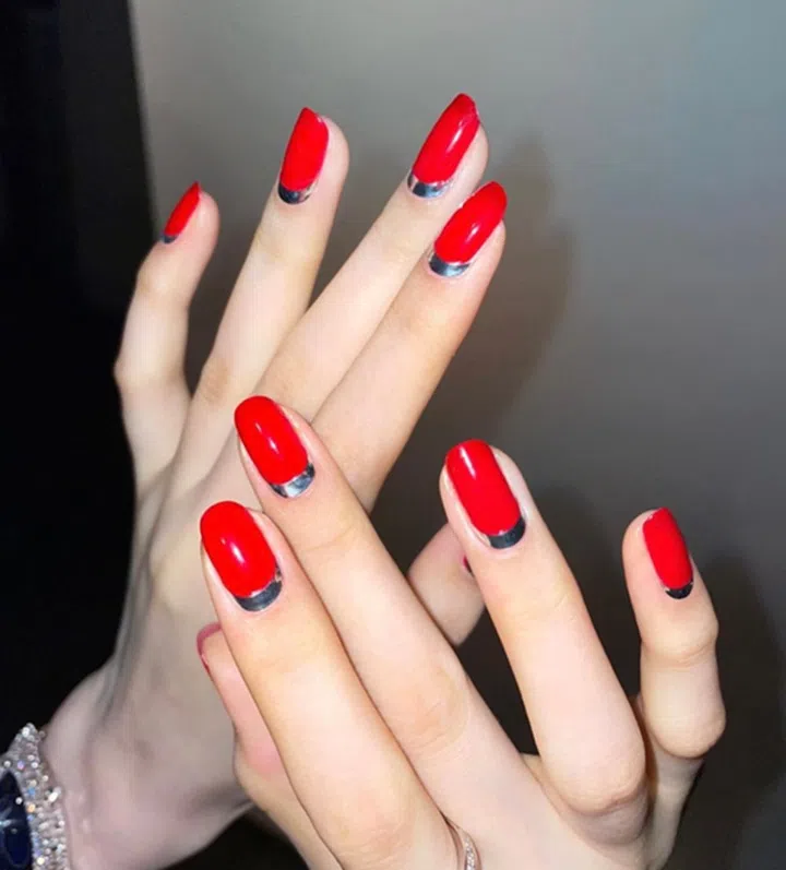 圣诞当然是要红彤彤!除了经典红色法式,女友们也可以尝试今年流行的反法式,把法式美甲的月牙设计画在指甲下方以chrome元素呈现,一定很亮眼。