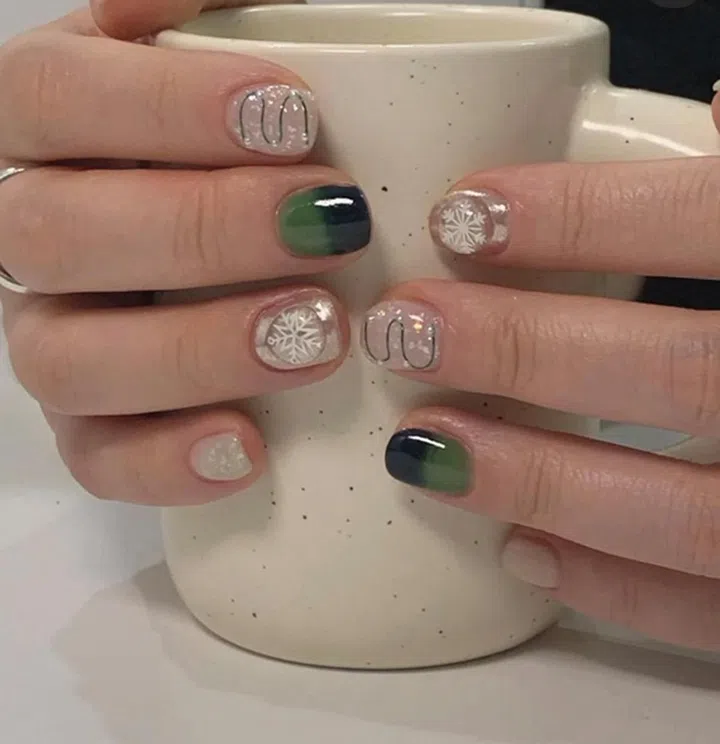 这款略带绿色元素的美甲比之前那款温柔了不少!透明镜面和裸色的指甲上带有极简风的圣诞树和雪花,美甲师甚至将美甲胶叠加至水滴的形状,让雪花看上去更加生动。