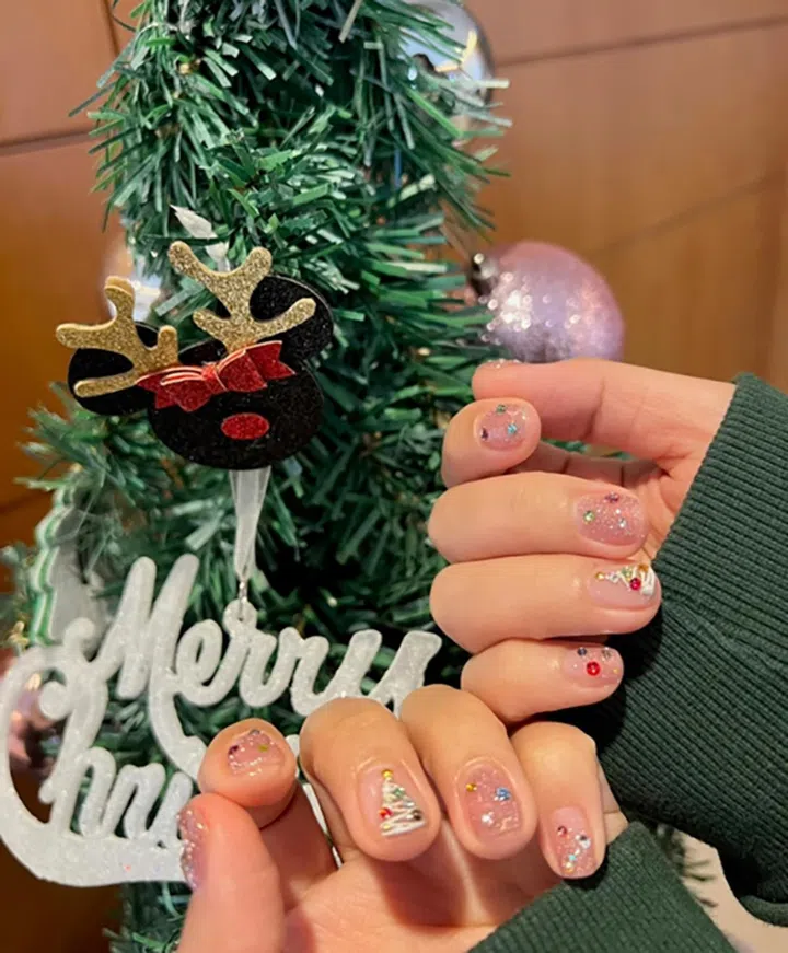 而这套裸色美甲就低调了不少~若隐若现的银色法式,搭配彩钻拼凑而成的圣诞树和圣诞花圈,无时不在透露着温柔的气息,让你忍不住多看两眼。