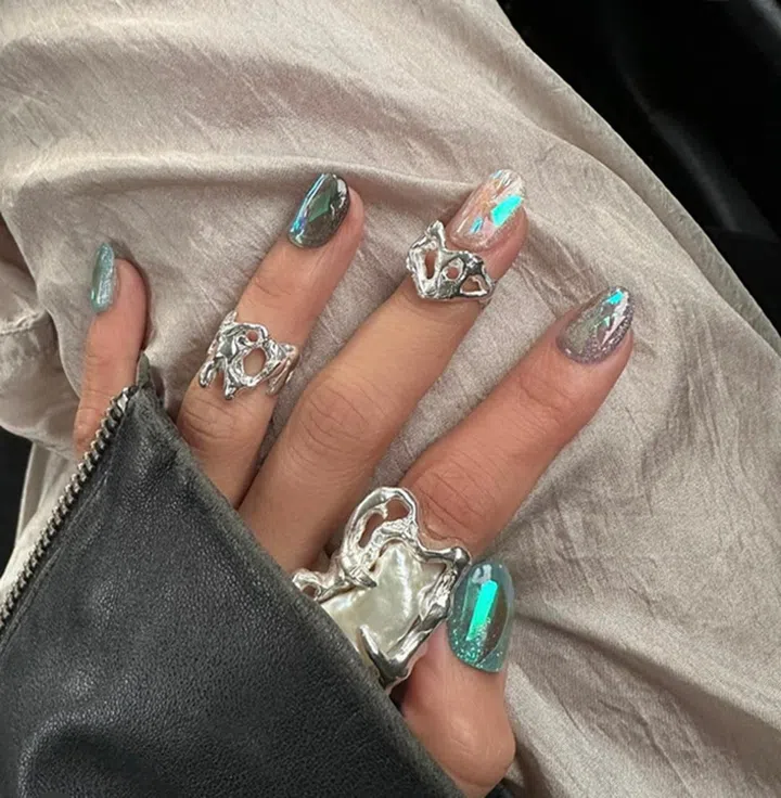 圣诞除了红色,还要有绿色。Nail Unistella的这款绿色玻璃美甲选用墨绿色打底,不会过于亮眼,再用充满玻璃感的镜面设计点亮整个美甲。追求前卫的女友们一定要试试玻璃美甲哦!