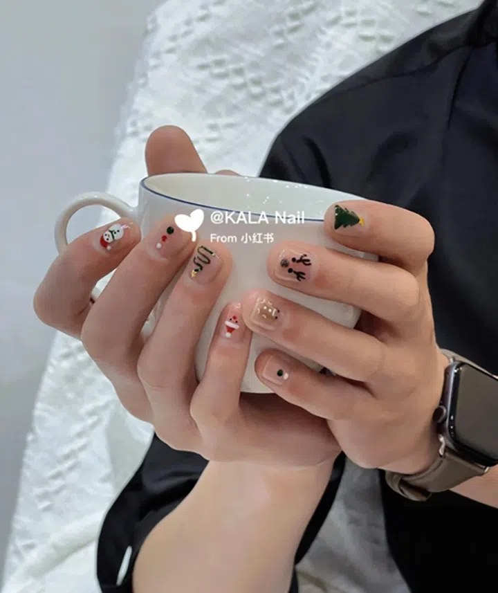 这款美甲精细的手绘令人佩服,有麋鹿、姜饼人、圣诞老公公,就连圣诞树上的装饰也不放过!你知道吗?其实它可是韩国男生美甲的选择,而且在裸色的指甲上手绘可是韩国美甲的一大趋势。