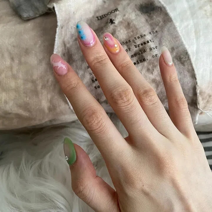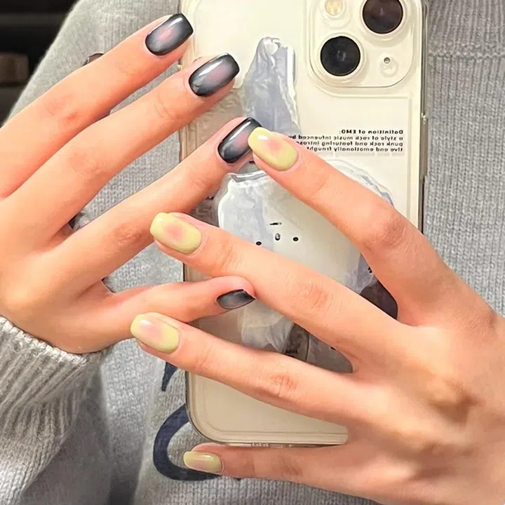 腮红元素也非常y2k哦~与其在腮红甲上加上大量的点缀,不如选择两手不一样的颜色来提升美甲的设计感。黑粉色的那只手真的很Blackpink,而牛油果绿和粉色的搭配也巨可爱。