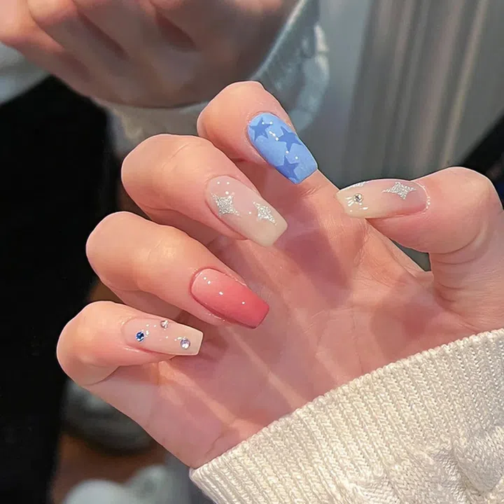 这款可甜可辣的轻千禧美甲,颜色组合超嫩!虽不是果冻般的透色,但看上去却很有清透感,再加上中指的四芒星,整体青春有活力。