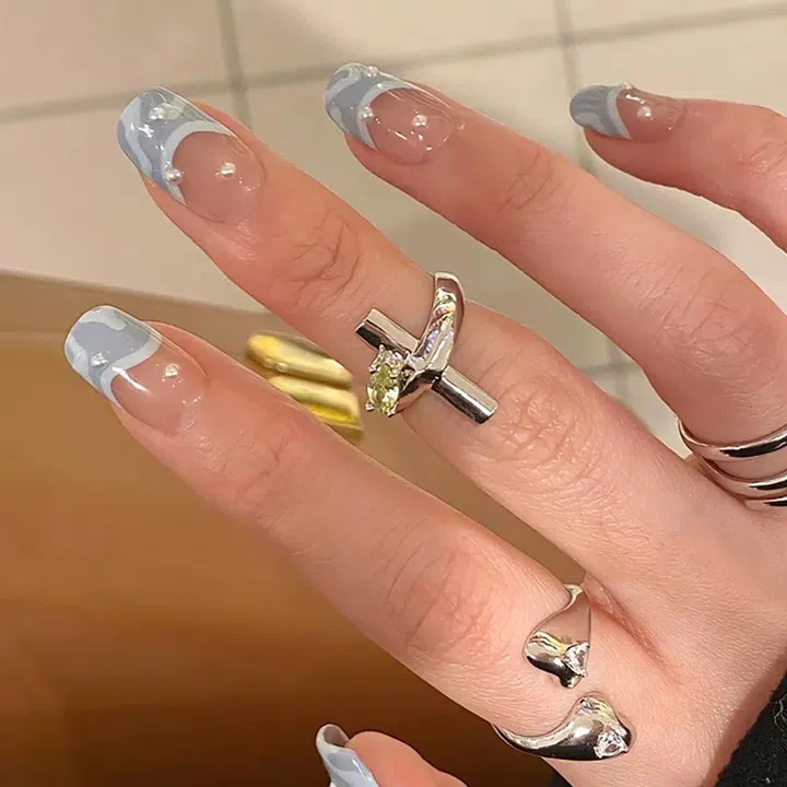 这款美甲的原版其实是被#Barbiecore潮流所影响的芭比粉色!低调的女友将法式的部分改成了清爽的蓝色,不仅保持了原有的”塑料感“,而且看上去特别适合夏天。