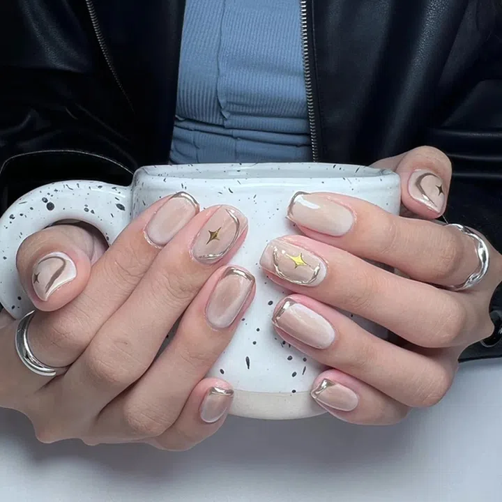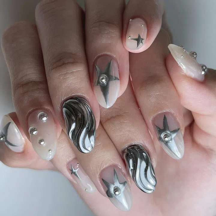 金属和星星都是千禧风主要元素之一。这款美甲虽没有千禧风美甲色彩丰富的拼凑,但冷色系的金属也足以带出千禧千金的感觉。