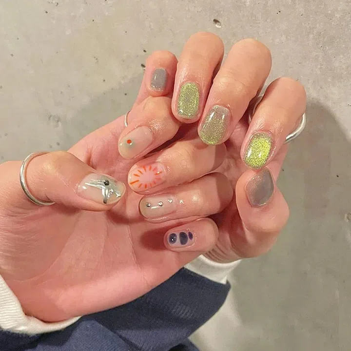 荧光绿的猫眼在不同灯光下透出灰色的底色,中和了绿色猫眼的高调,且很是神秘。另一只手的设计则是低调版的“泰式塑料风”,每个手指上不同的设计也很适合性格丰富的你!