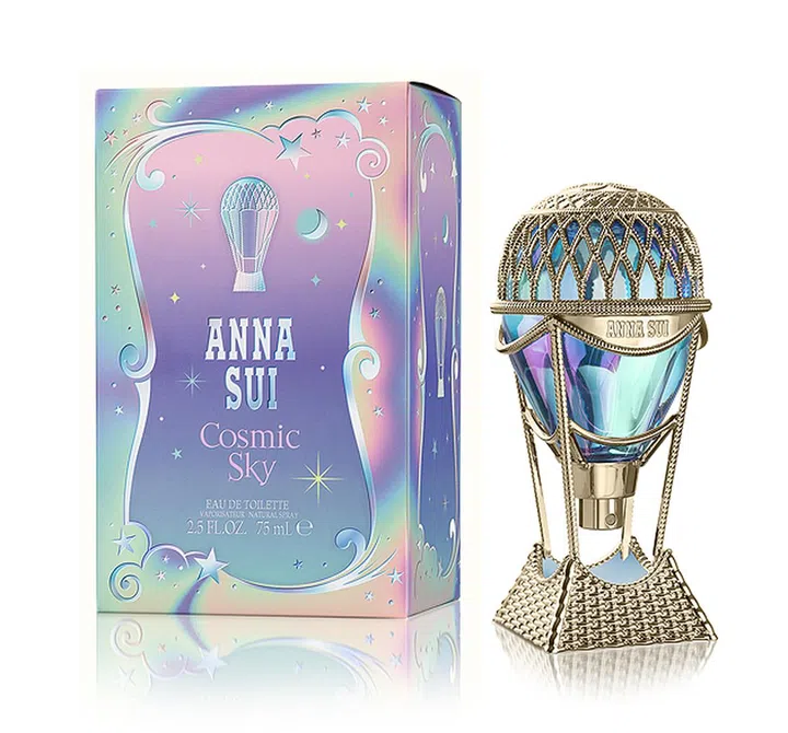 Anna Sui创新推出Cosmic Sky香氛以独特的热气球造型亮相,配有华丽的金色藤篮包裹着精致的冰蓝色的瓶身。这款香氛是以轻甜的“花果香气”贯穿,前调采用鲜甜多汁的梨子和佛手柑。中调则为馥郁的鸢尾花、苹果花和黄葵籽香气,为此香氛添加些许活泼的元素。后调则以琥珀、冰糖和木香相互堆迭,创造出具有层次感的香气。