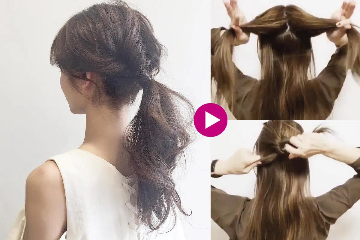 扎出马尾之前,先分出上下两半。将上半部分分成两束,并打成两个结,最后把剩余的发丝收成一束马尾,同样仅用一根皮筋,依旧可以打造另类马尾哦!