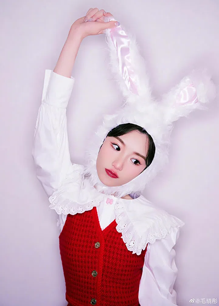 毛晓彤的镜面红唇是水嫩嫩的橘调烂番茄色,清透、清亮又温柔。带上兔兔耳朵,整体清纯又喜庆。