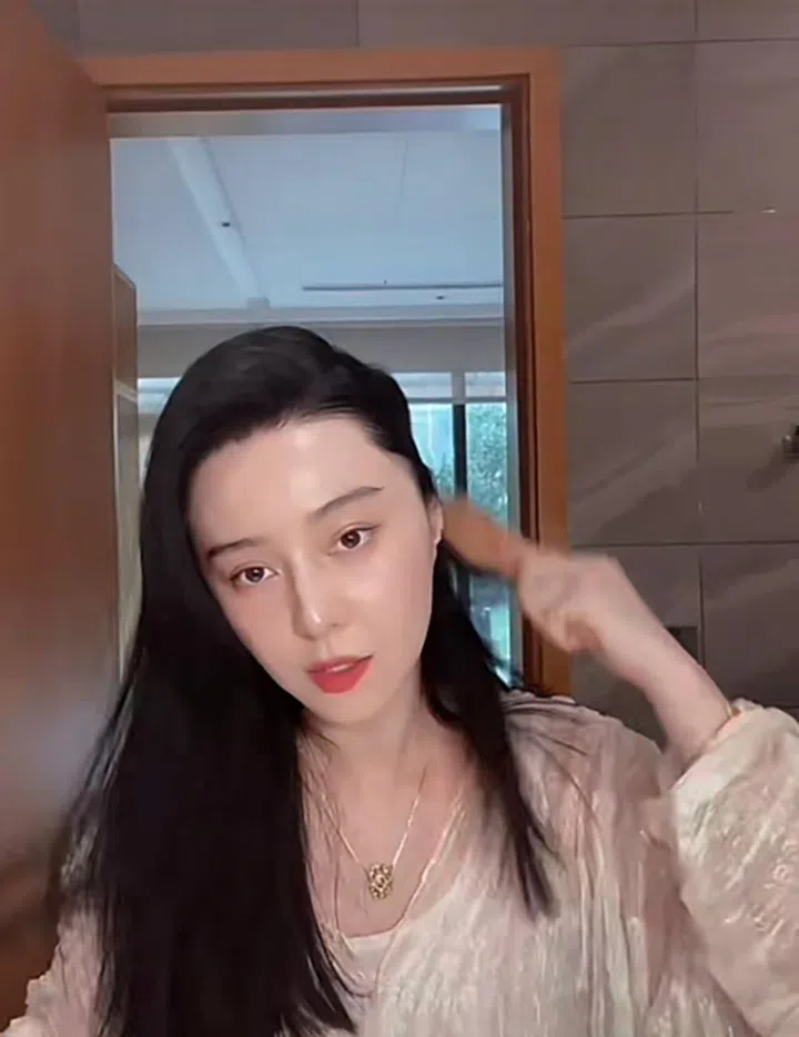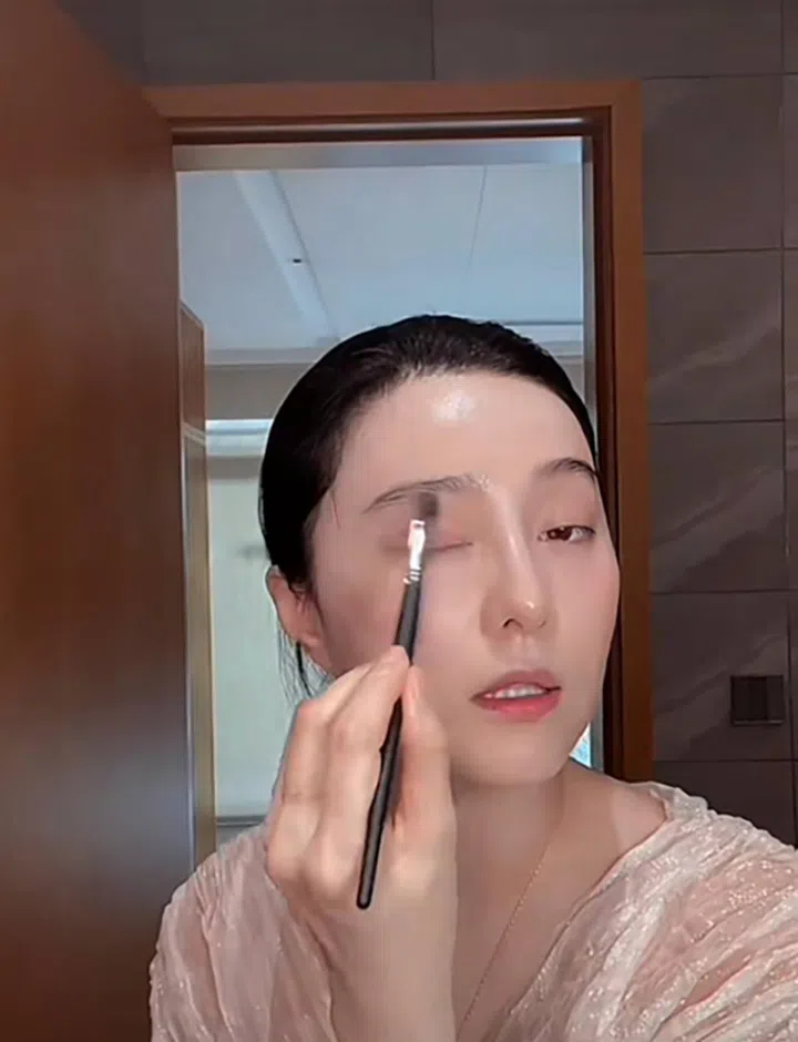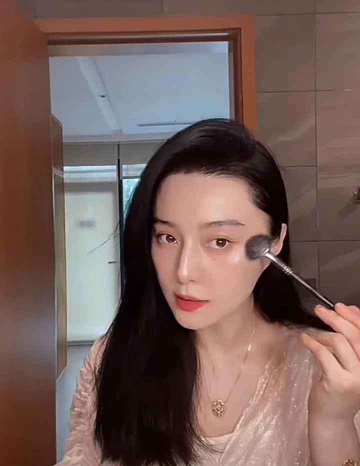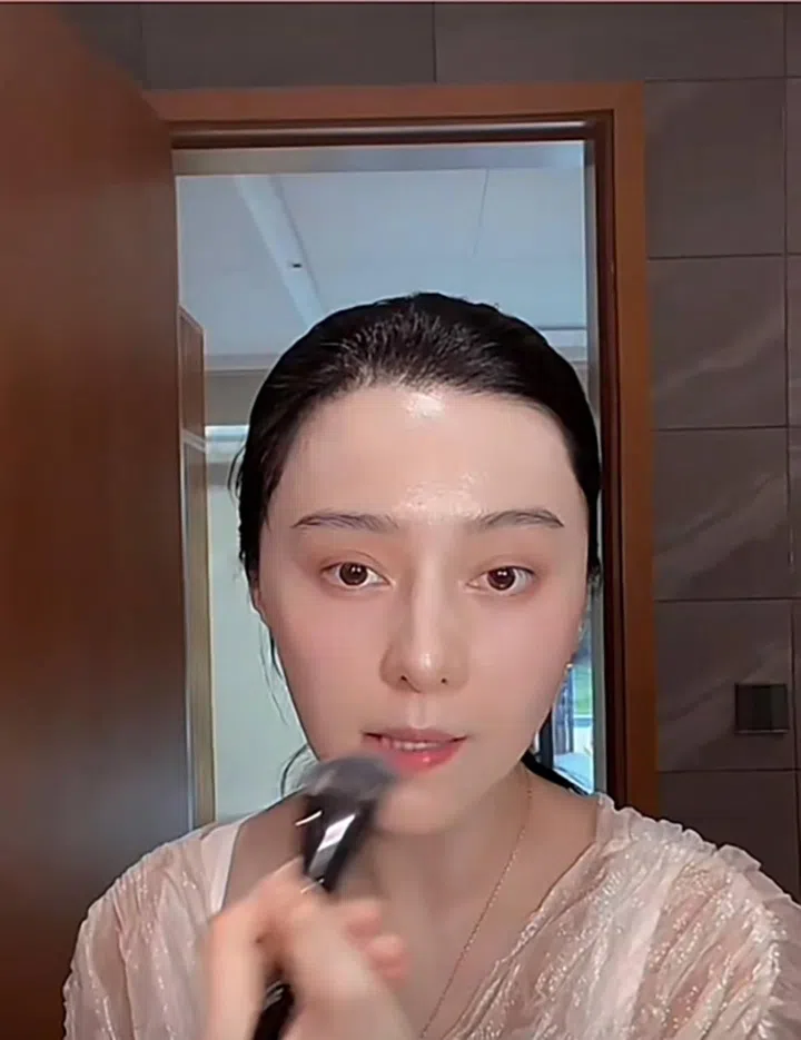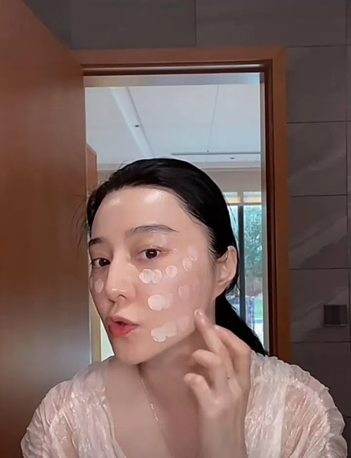 真正的化妆才刚开始!她在视频内用到的是一款纯净(clean)底妆,特别适合皮肤敏感时使用。范冰冰只取了一点点用手指点到脸上,再用化妆刷涂匀。她也并不会像其它美妆博主那样选用不同颜色的遮瑕和修容,只要肤色均匀就好,这样做也能省不少时间。
