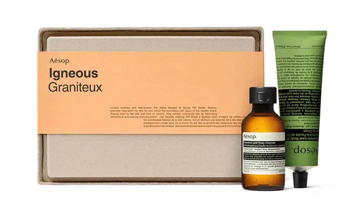 Aesop今年的圣诞主题为“The Poetry of Place”,灵感来与世界各地的Aesop店面,用再生纸重塑成不一样形态的圣诞礼盒,从而表达出品牌不同店面当地的风土人情。Igneous礼盒外形是位于悉尼Pitt Street的店面,里面包含Geranium Leaf系列的沐浴乳和身体乳,都是旅行装,更方便携带出游。