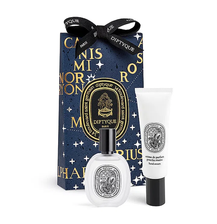 Diptyque将今年圣诞款香氛描绘成闪耀的星空画卷,让蜡烛带来柔光,点亮夜晚。这套玫瑰惊喜里包含了荔枝玫瑰的发香喷雾,女友们可在随身携带,在需要时喷两下,从“头”开始做个精致女孩,香喷喷同时还能护发,一举两得实属完美!另外,组合里面还有同香型的护手霜,玫瑰味道浓郁,每次使用豆子大小即可!
