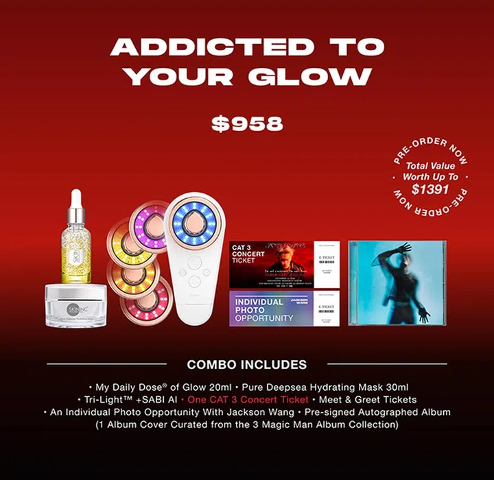 上次无缘与王嘉尔碰面的女友们这次可别再错过啦!本地品牌Skin Inc成功邀约王嘉尔,在12月21日与大家见面。但凡购买Skin Inc圣诞组合就有机会获得私人活动入场券,与王嘉尔近距离接触,先来先得哦。Addicted to Your Glow Combo套组包含Tri-Light™ +SABI AI光疗仪和精华,让你的居家护肤效果加倍。