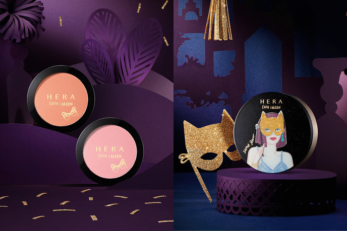 为了纪念Black Cushion气垫霜推出一周年,Hera就与著名法国籍插画家Edith Carron合作了以“神秘派对”为主题的联名彩妆系列。包装以蓝紫色调渲染出高雅、魅惑的气息,更结合霓虹、黑金与面具等元素,营造出低调却奢华的高质感。