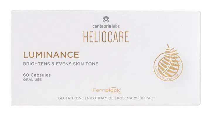 Heliocare Luminance是品牌新推出的亮白口服胶囊,取代了之前的PureWhite Radiance Max 240。全新配方专为亚洲皮肤所量身打造,含有Fernblock、谷胱甘肽、烟酸胺和迷迭香提取物,可预防和改善黑斑和黑色素沉淀,同是修复导致皮肤老化的DNA损伤。其中,Fernblock成分是Polypodium Leucotomos的专利植物提取物,这种光免疫保护技术可刺激皮肤的自然防御系统,每粒Luminance都含有240毫克的Fernblock®,服用2-3个月即可见效。