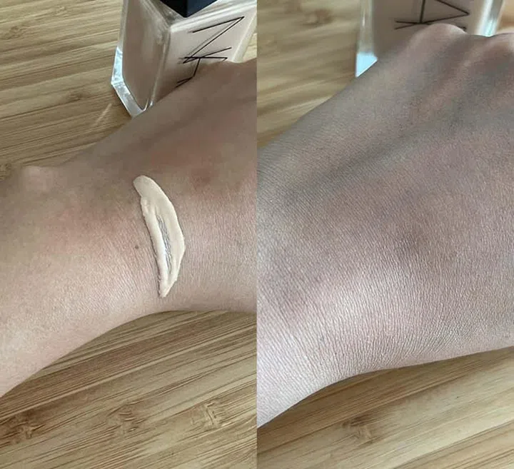 使用感:遮瑕度偏高的粉底液只需一点点就足够遮盖全脸。因其水润的质地,女友们可放心进行叠加,我也会在上完第一曾底妆后再取少量进行局部遮瑕,这样就可避免假面。我肤质属于混合性偏油,所以这款粉底液在我上妆6小时后就会开始出油,然后开始逐渐脱妆。但这也表示它有足够的滋润力,更推荐给干皮,或有卡粉困扰的女友们。最吸引我的点则是粉底液的轻盈,因遮瑕力高而不需过多用量,因此上脸后也丝毫不会感到有底妆的存在。使用感除外,我也发现此系列的粉底色号会偏白。如果你是黄一白肤色,那么可能需要选择Nars更深的一个色号哦!