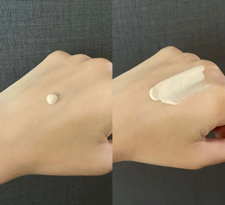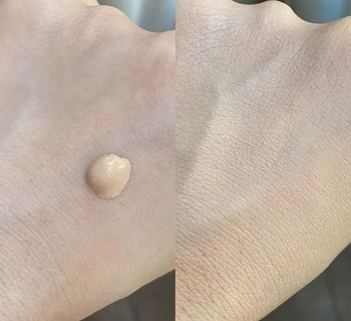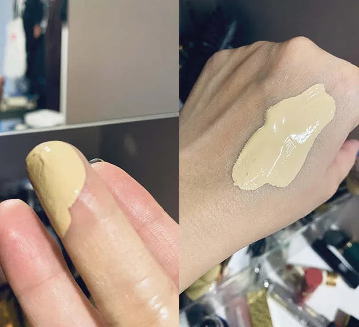 除了亲肤色,它也非常贴合肌肤。涂抹的时候一直觉得仿佛有种黏力(我用手指涂抹),可是却不影响延展力,粉底液三两下就能均匀地“贴合”在肌肤上。或许因为贴合度好,其实用量挺省的,下方左图的分量,即足够涂满半张脸(从额头至下巴处)。所以每次一满泵几乎都用不完,多余的就会用来拍在瑕疵比较明显的地方,但即使这样也不会让该处的妆感特别厚重。