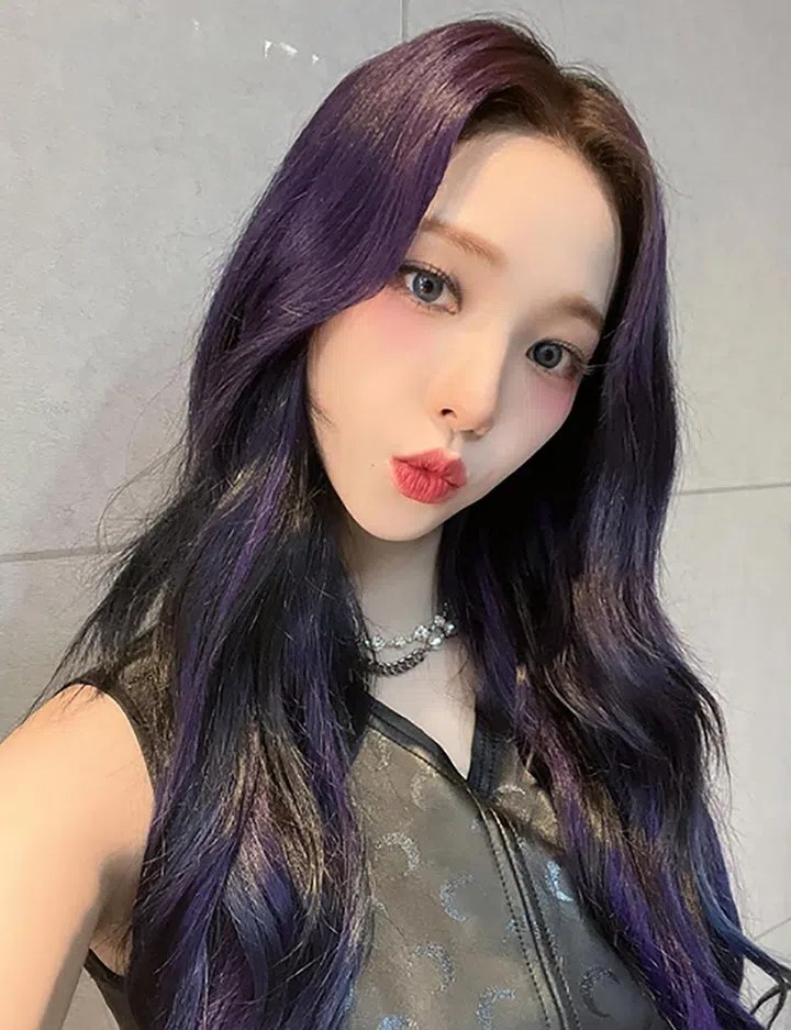 Aespa柳智敏的眼下腮红和紫黑色的长发搭配在一起,给人一种红酒微醺的神秘感。眼下腮红通常会与下眼影相连,请采取小型的刷子将下眼影往下带,再蘸取腮红色少量多次晕染即可,画法简单,氛围感却很强烈!