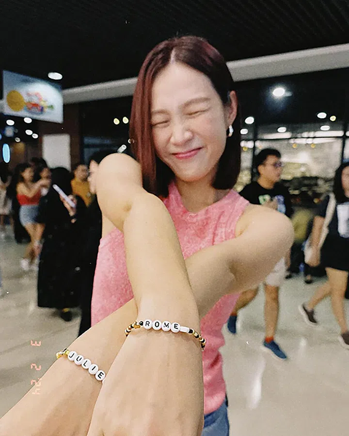 雅慧在现场穿着粉色上衣并秀出她的“Romeo”与“Juliet”友谊手链——为何很多人腕上都戴着满满的手链?串珠友谊手链(Friendship Bracelet)是Taylor Swift演唱会的必备品之一,曾在1970年代风靡一时,并随Taylor Swift去年3月开始世界巡演再度引起风潮。Swiftie会在“友谊手链”上串上自己的名字、喜欢的歌曲与歌名等,并在演唱会现场交换这些象征着友谊的手链。