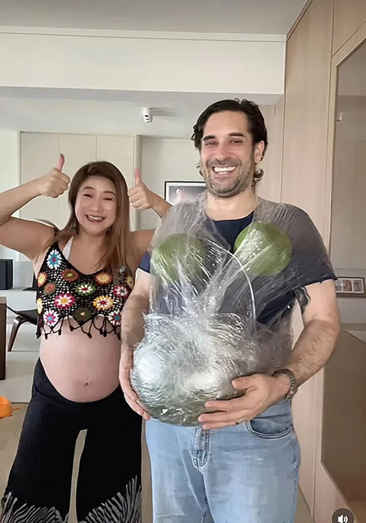 黄湘怡2020年与前夫结束9年婚姻,去年迎来人生第二春。她与英国籍老公Jon相恋3年,感情开花结果,去年10月结婚, 12月宣布怀上龙宝宝,喜事成双~43岁的Stella虽然是高龄产妇,但依然活力十足,不时在IG分享孕妈生活,早前和老公搞笑录制“西瓜挑战”视频,Jon用用保鲜膜把西瓜绑在肚子上,体验孕妻挺巨肚的日常~