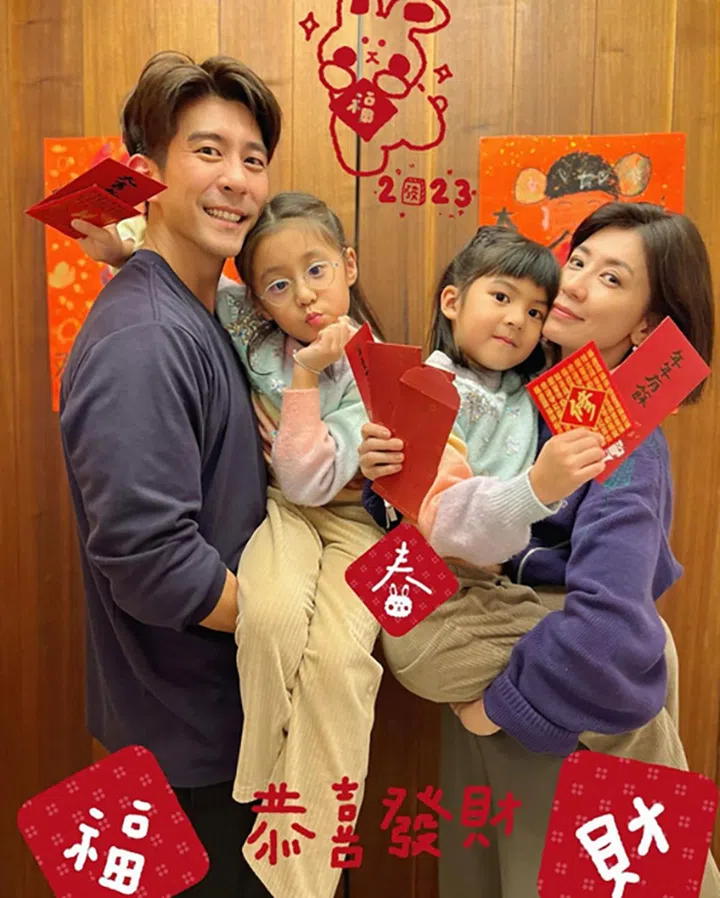 香港女星杨茜尧与演员老公罗子溢结婚7年,育有一对宝贝子女,大年初一分享全家福,标示了“#罗氏家族”,发文祝福大家:“恭喜发财,祝大家身体健康,心想事成,兔(吐)气扬眉。”
