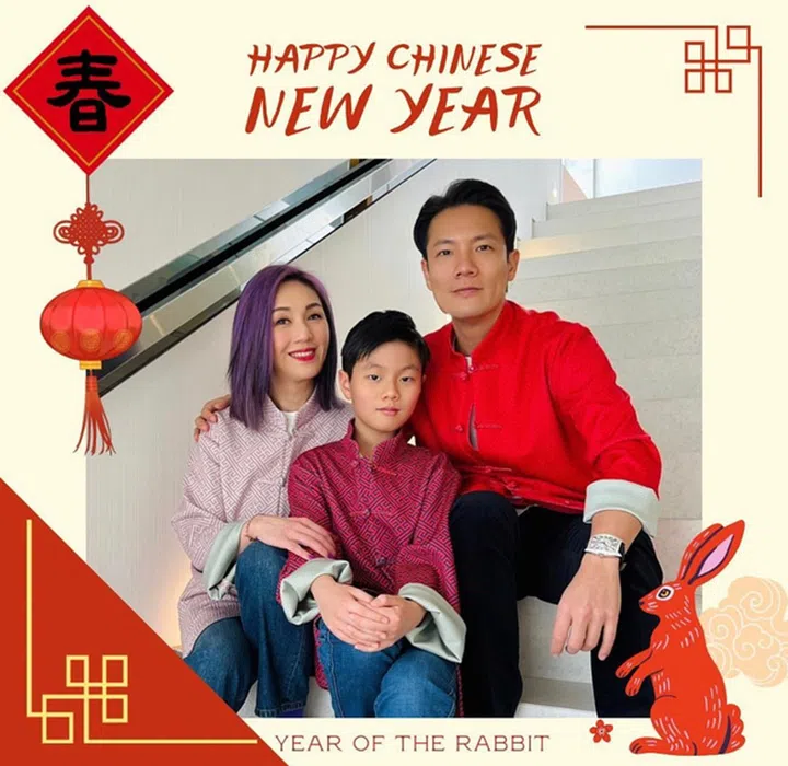 香港天后杨千嬅2009年嫁给小5岁的丁子高,2012年两人的儿子Torres出生,组成一家三口。喜迎兔年,杨千嬅罕见地分享了儿子的正面照,10岁的Torres坐在父母中间,总体而言长得更像爸爸。她也发祝福文:“恭喜发财﹗我们还有很多事情要一起庆祝,所以祝大家身体健康,兔年一起从音乐再出发。”