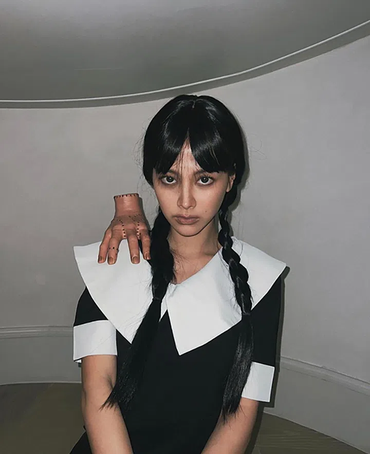 泰国人气女星Baifern扮演的角色Wednesday,源自美国恐怖喜剧《Wednesday》。她完美复制角色标志性的齐刘海+双辫发型、黑眼圈烟熏妆和“中毒唇”,画龙点睛的一笔是她肩膀上名为“Thing”的断手,cosplay细节满分到位!