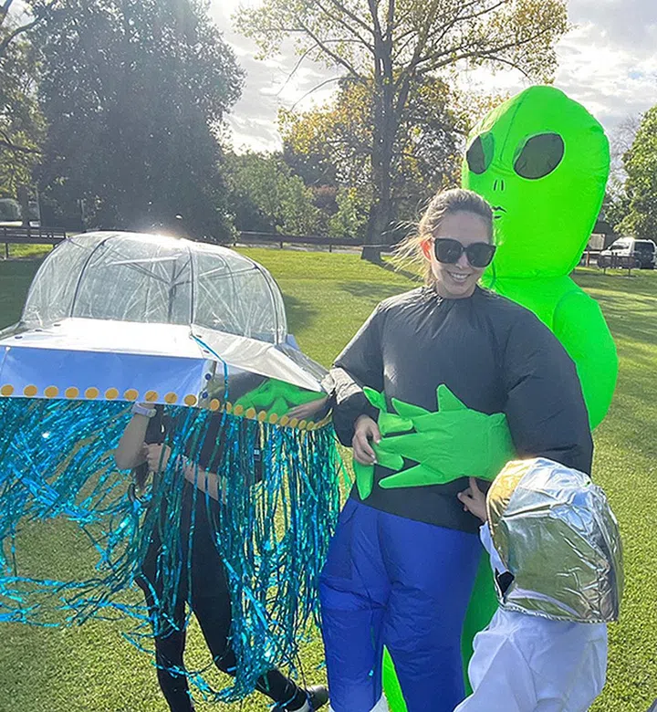 天王嫂昆凌在IG限时动态分享了和孩子们的万圣节造型,有UFO飞船、外星人出没,她本人则扮演“被外星人俘虏的人类”。有趣的是,孩子们的UFO飞船是由昆凌亲手制作的,十分用心!照片中不见周杰伦的人影,但周董随后也在限时动态转发老婆的照片,搞笑留言:“会不会有人觉得我是后面那个外星人……”