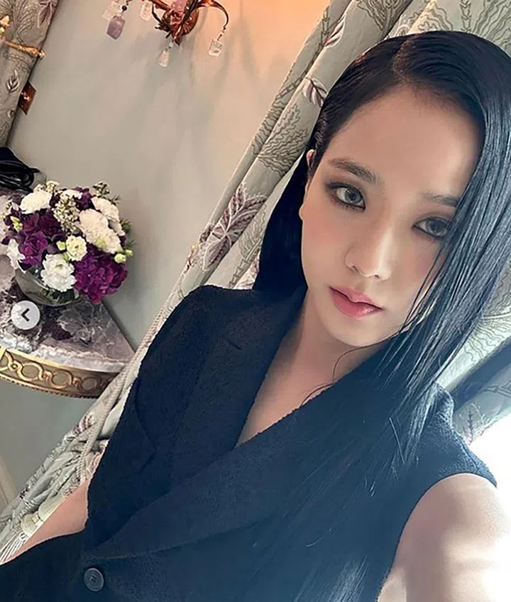 Jisoo在这次的时装周主打一个大反差~ 在Dior的巴黎秀场上身穿全黑的无袖西装裙低调看秀,原来Jisoo的造型亮点在眼妆。她选择了较大胆的烟熏妆眼妆搭配浅灰色美瞳,眉毛则是不规则的野生眉,连唇色也是似有似无的裸色,以突出眼妆的细节。
