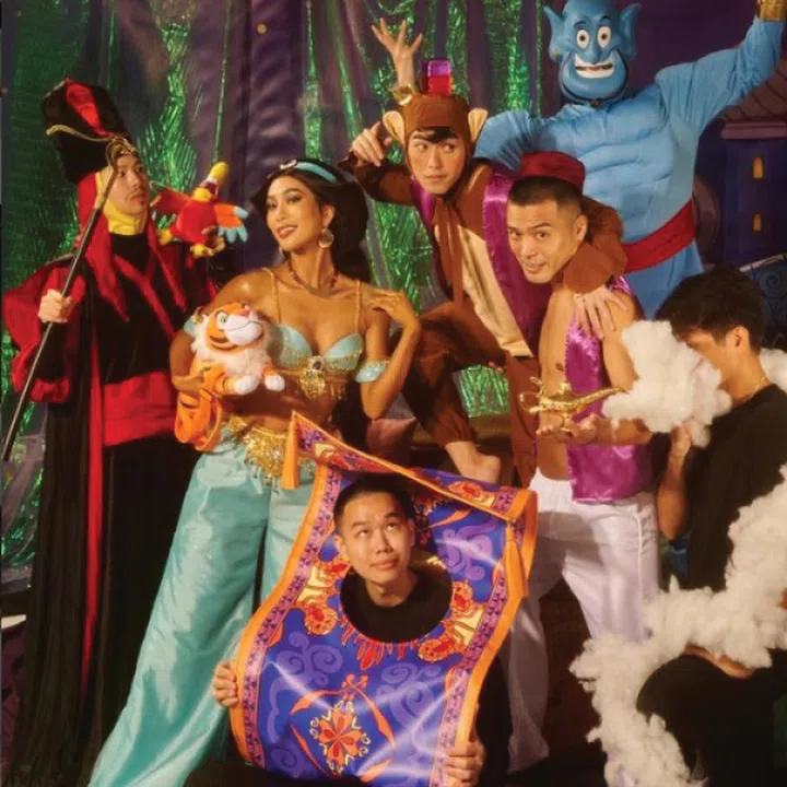时尚百变女王Molly今年带上团队扮演迪士尼人物,而她扮演的就是《阿拉丁神灯》中的茉莉公主,队员们也要扮成魔毯、阿布猴子、神灯等无厘头的角色配合。
