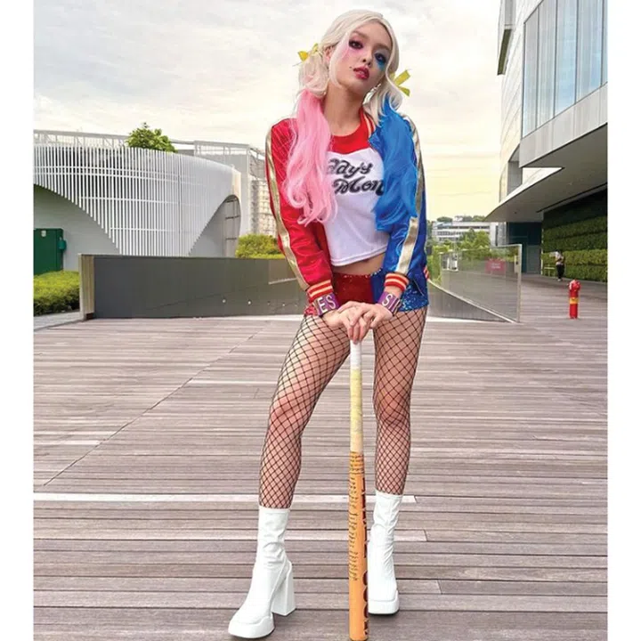 Hazelle小丑女装扮的细节——红蓝辫子、棒球棍、黑丝袜、靴子、夸张的妆容,可是一个都没落下,可见她对万圣节的用心!