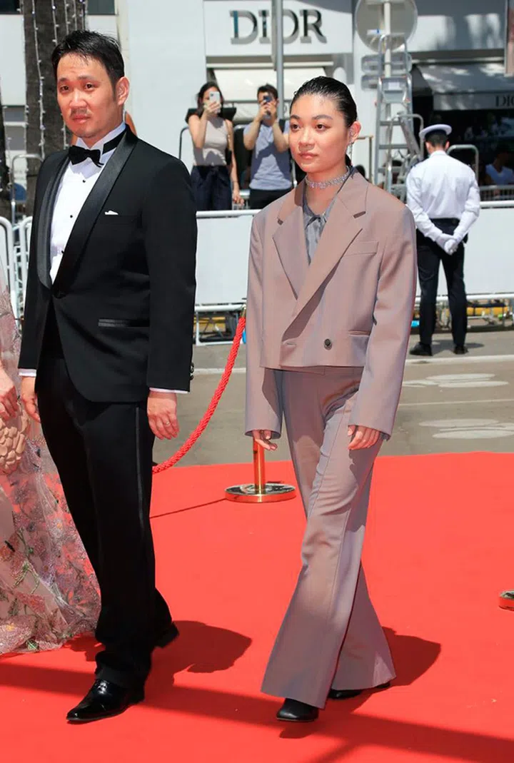 电影《Drive My Car》演员、日本女星三浦透子身着短版oversized西外套, 配搭同色阔腿西装裤,全往后梳发型更显干净利落,佩戴珠宝choker和耳坠,大胆演绎个性红毯装束。