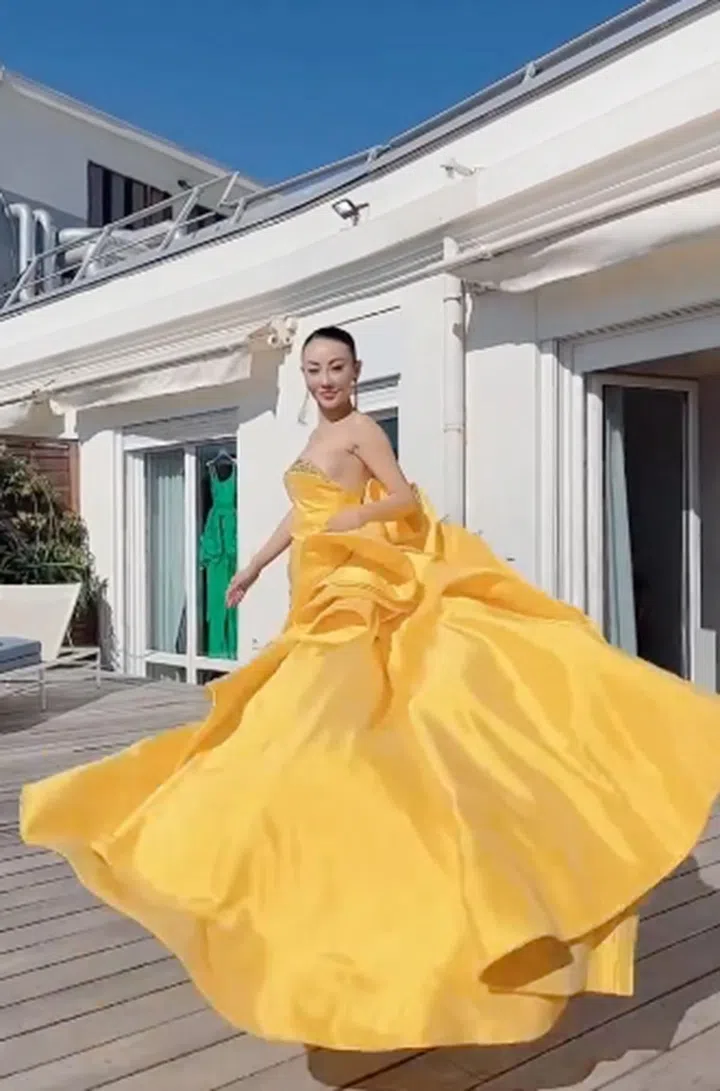 现居美国的亚裔时尚博主Jessica Wang一身亮黄色礼服来自Tony Ward的高级定制服装系列,大胆夸张的滚边剪裁设计更添气场架势。长链款式的耳坠则来自法国小众高级珠宝品牌Messika。