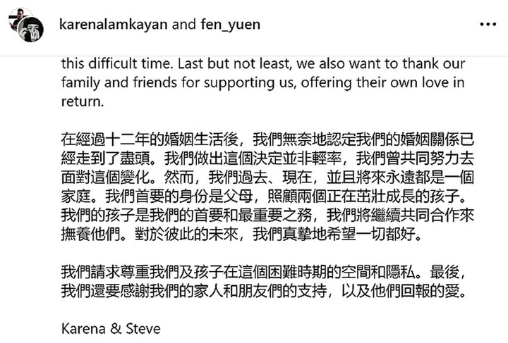 7月28日,林嘉欣在IG上无预警宣布,与年长13岁的丈夫袁剑伟结束12年的婚姻生活。她说,这并不是个“轻率”的决定,两人在意识到问题后,曾努力过尝试去改变 & 解决,然而还是无奈走到婚姻的结尾。共同抚养孩子仍是两人的首要+重要之务,希望大家能够在这困难时期给予他们和孩子空间和隐私。