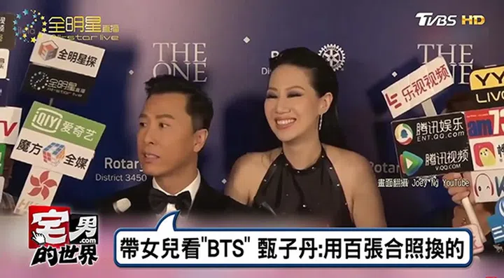 BTS在2017年5月17日香港举办演唱会,甄子丹被目击陪女儿到场支持偶像。他女儿是防弹少年团的Army粉丝,但其实Jungkook反倒是甄子丹的粉丝。甄子丹为了宠女儿,用一百张合照(与在演唱会的工作人员们拍照),换取女儿和防弹少年团合照的机会。