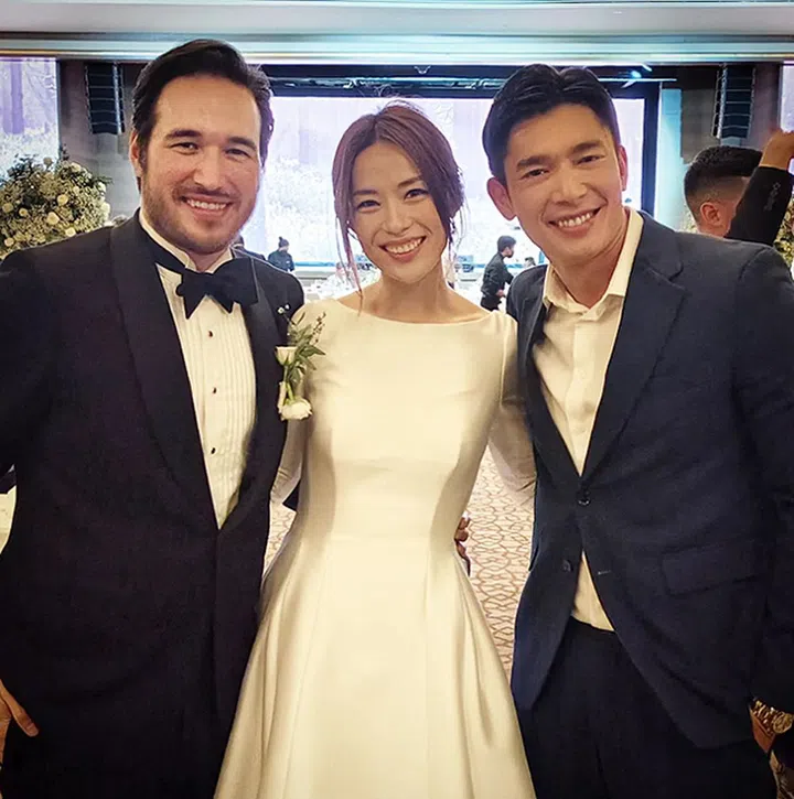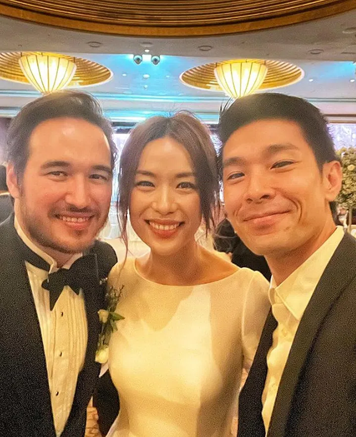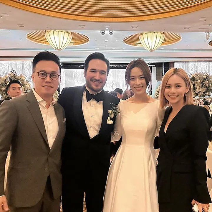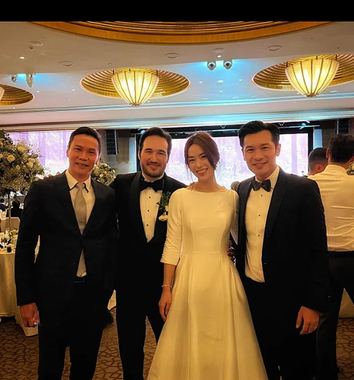 “恭喜我的好搭档终于出嫁了,昨天看到你就是幸福的样子真的替你高兴。祝你幸福美满,新婚快乐!welcome to the club😁!!”看来陈泓宇“入会”多年还是挺享受的,盛装出席的他(还系上领结),宛如红毯造型,合照中也见到了黄炯耀。